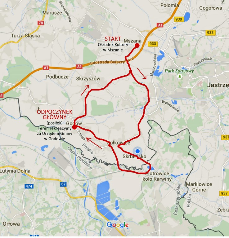 Startujemy na ul. Mickiewicza przy Ośrodku Kultury w Mszanie, dalej ulicą Styry i równolegle do ul. Spacerowej. Przejeżdżamy wiaduktem nad autostradą do ul. Wałacha i w ul. Dąbrowskiego. Ulicą Partyzantów dojeżdżamy do Osiedla Złote Łany w Jastrzębiu-Moszczenicy. Stąd kierujemy się w stronę Gołkowic i w Skrbeńsku przekraczamy granicę państwa. Dojeżdżamy do czeskich Petrowic, a stąd jedziemy do Gołkowic i dalej do Godowa (teren rekreacyjny za Urzędem Gminy). Czas na dłuższy odpoczynek i posiłek. Oficjalna część rajdu.