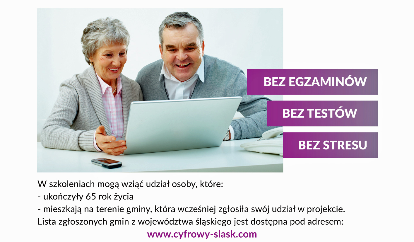 Zapraszamy osoby w wieku powyżej 65 lat. W programie szkoleń m.in. praktyczne umiejętności obsługi komputera, tabletu, smartfona. Szczegóły na: https://cyfrowy-slask.com/